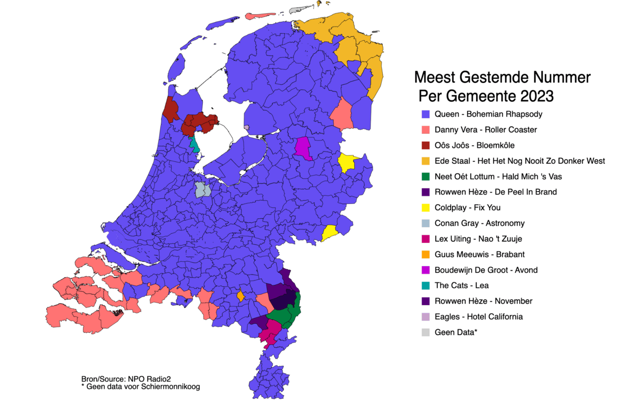 Wat valt op? In veel gemeenten is Queen het populairste liedje, maar veel grensgemeenten kiezen een andere nummer 1 🥇